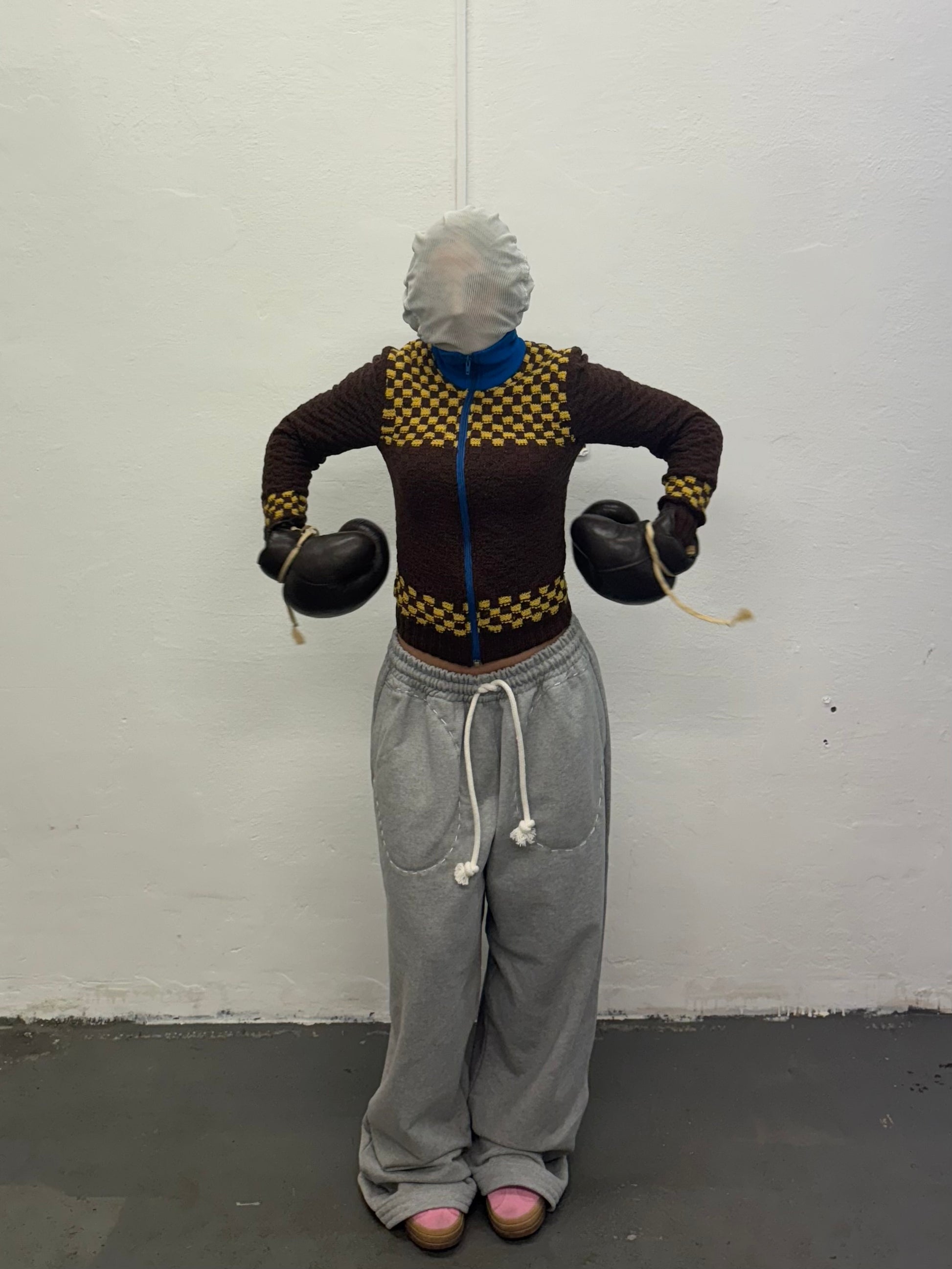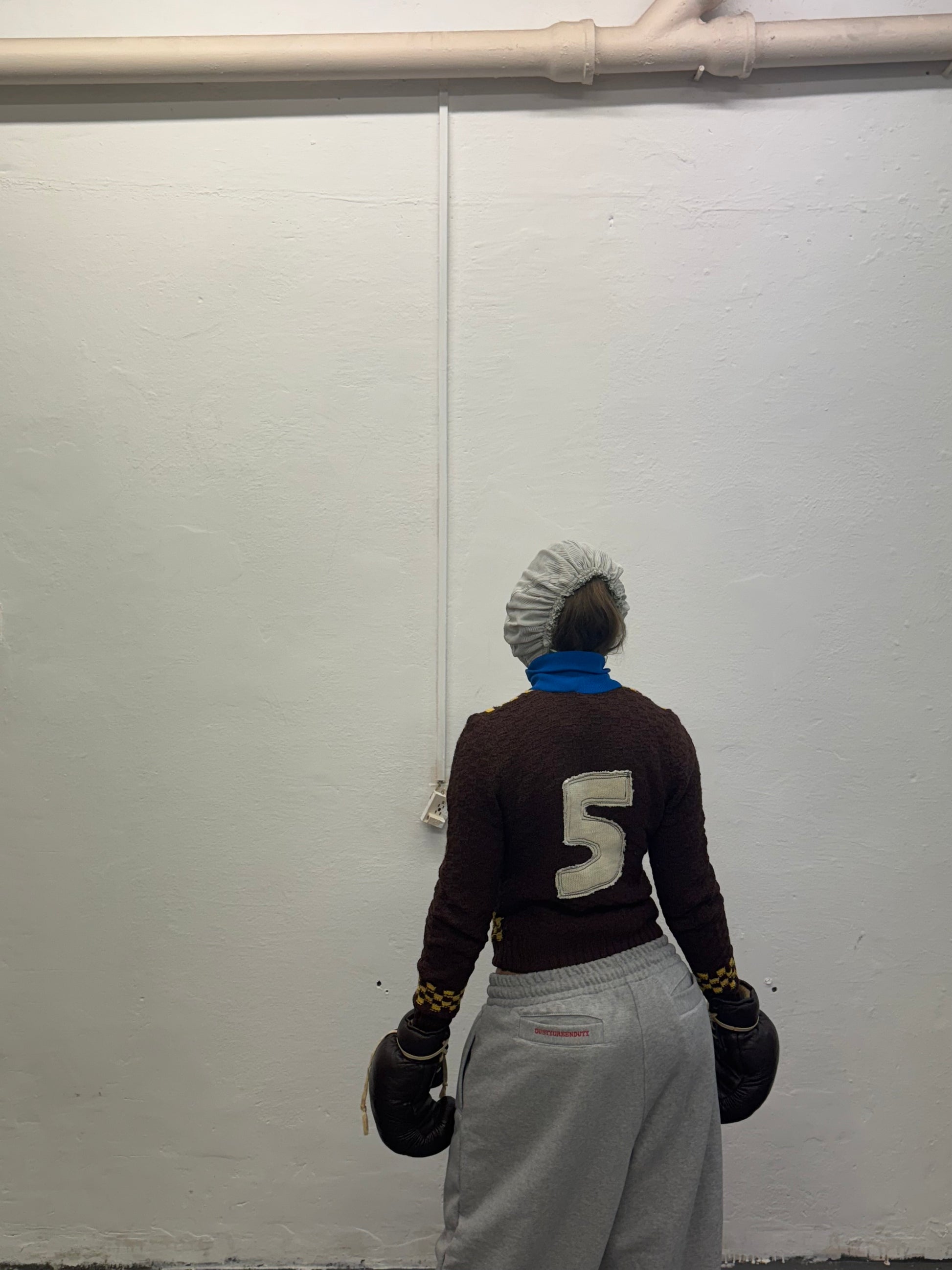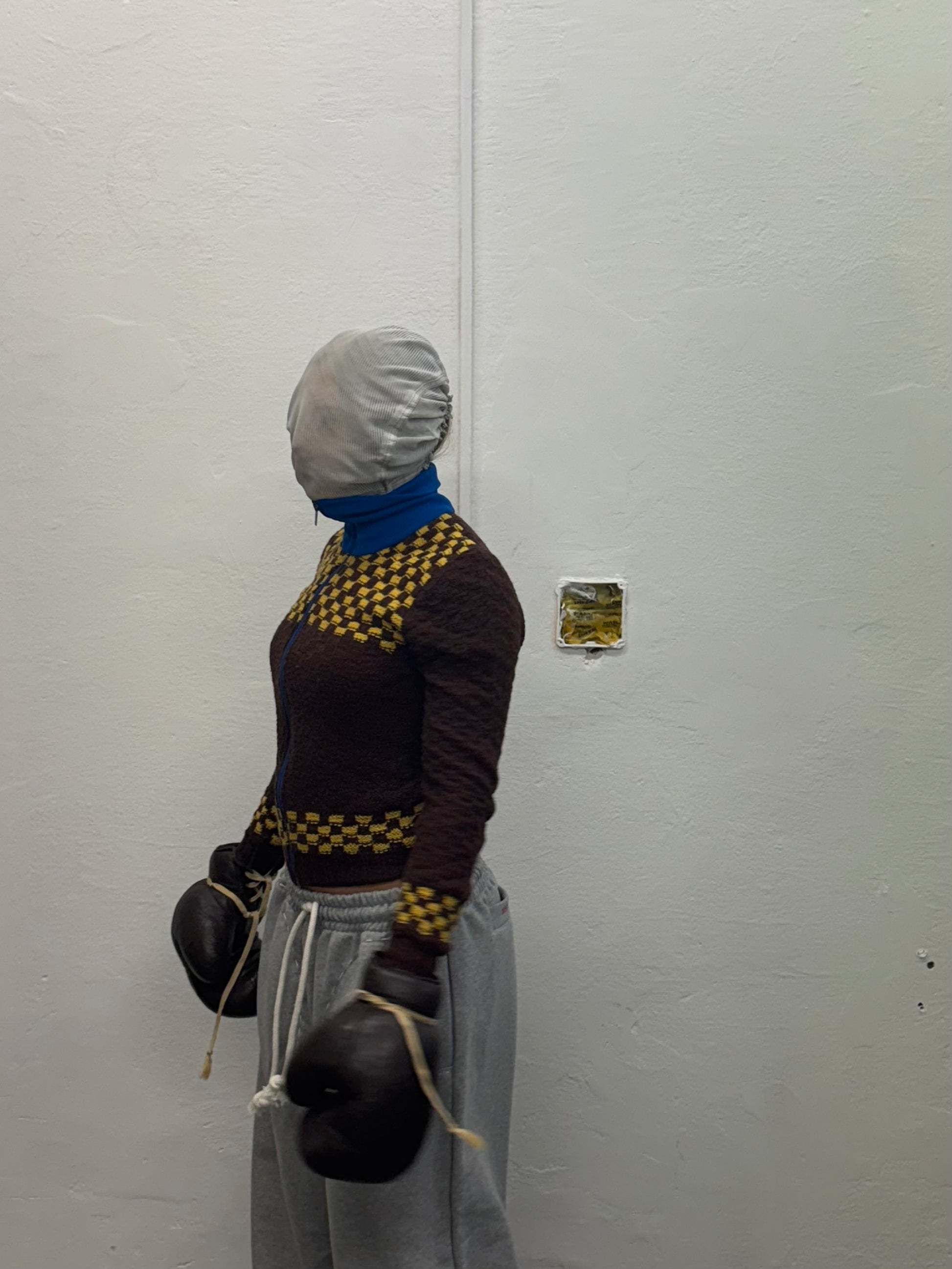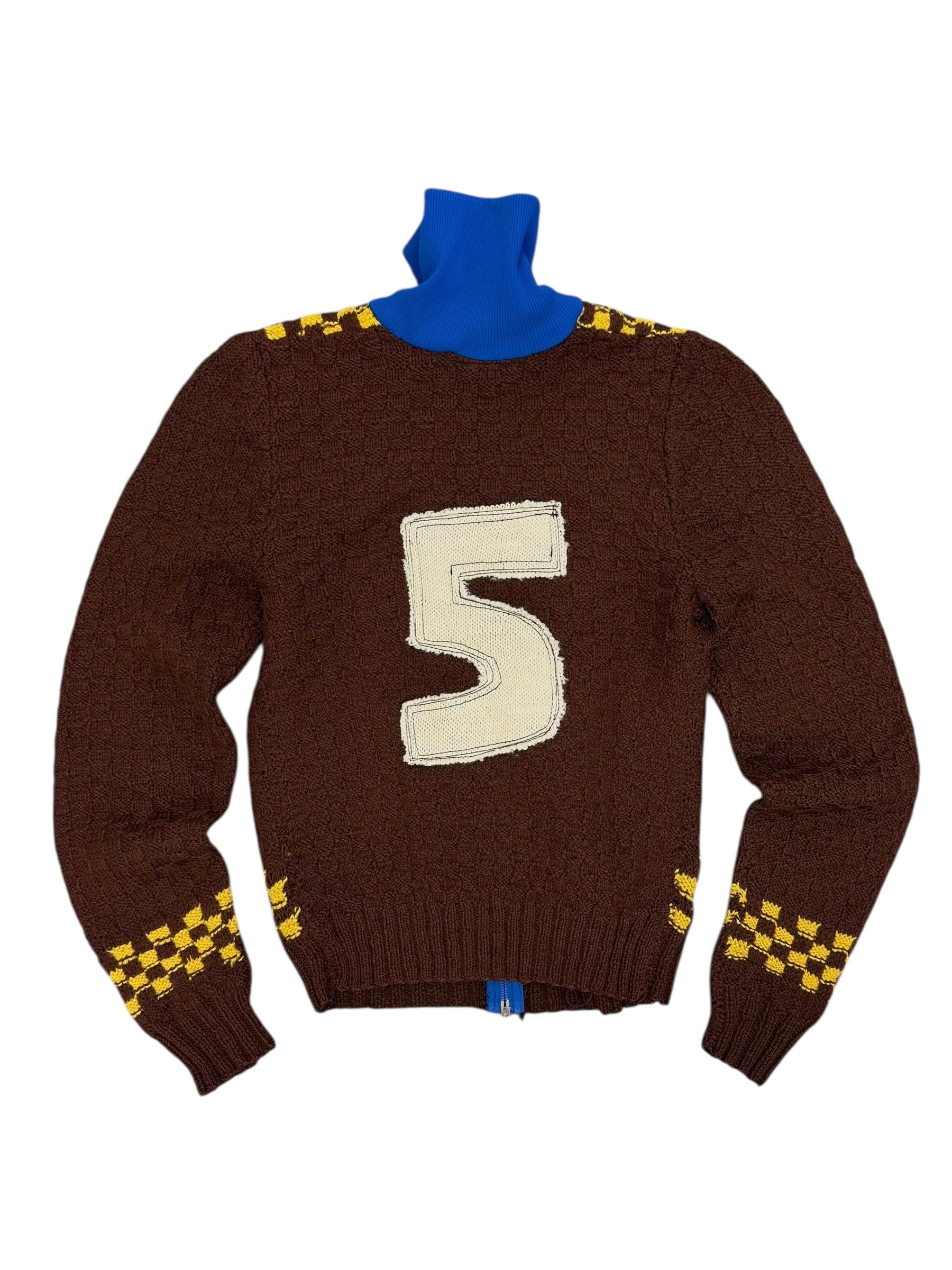 -Vintage hand-knit sweater, reconstructed with a full front zip and a high ribbed stand-up collar in contrast blue