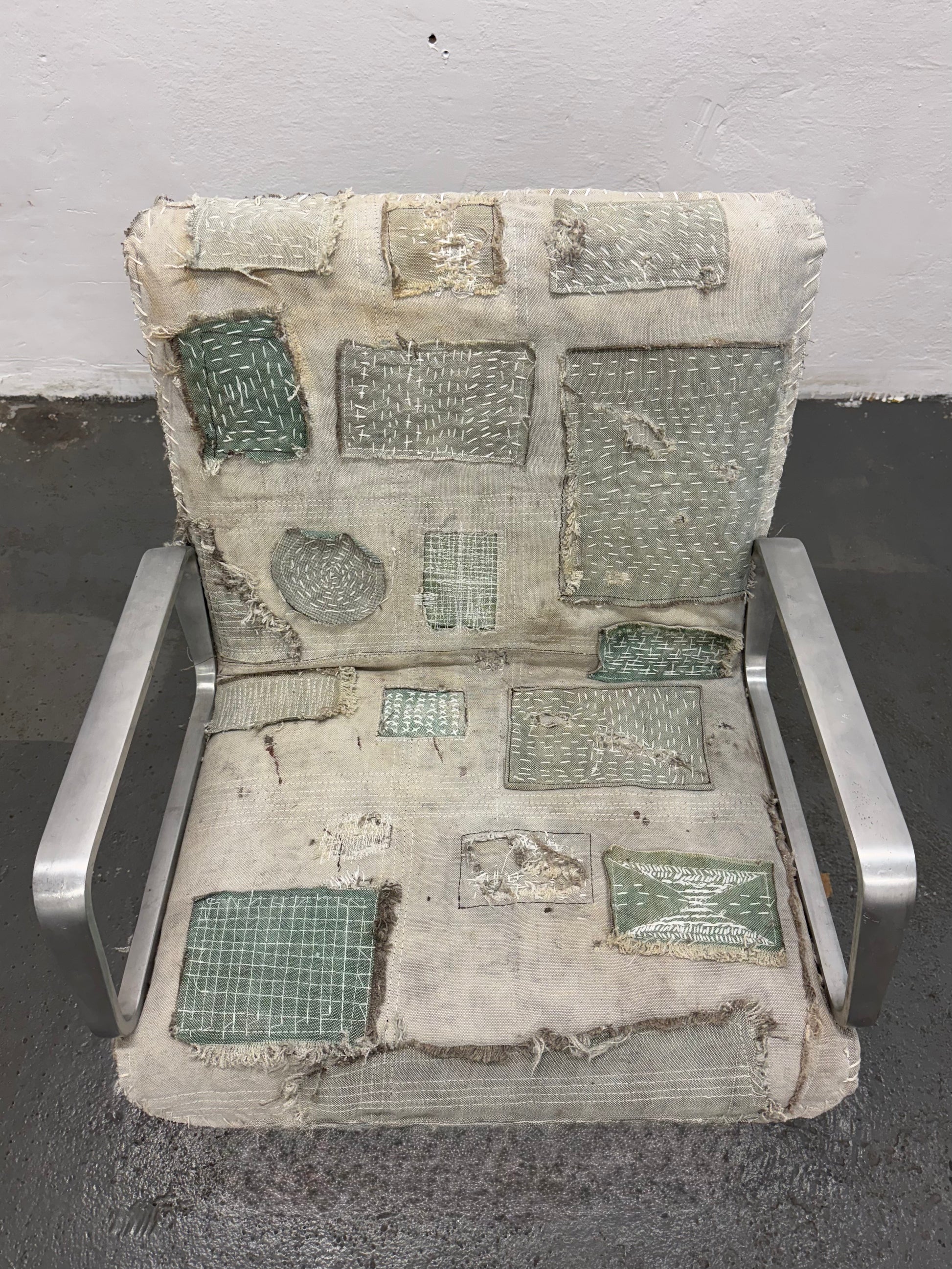 Each stitch, fade, and patch tells a story of renewal, giving the chair a new context and singular character.