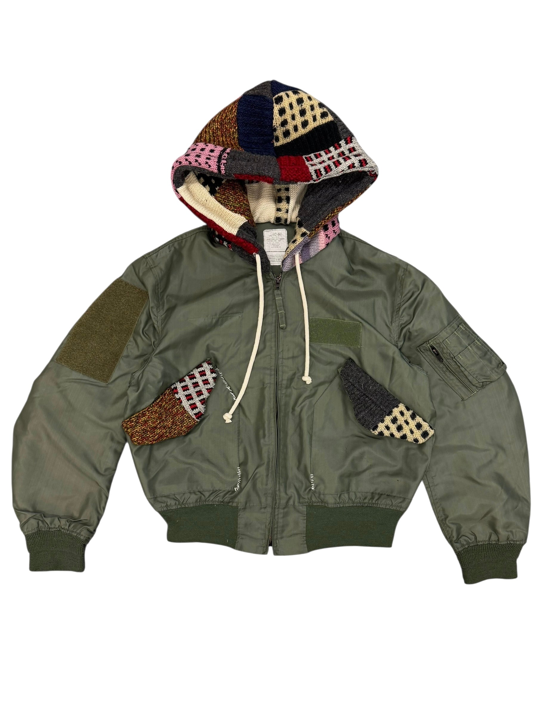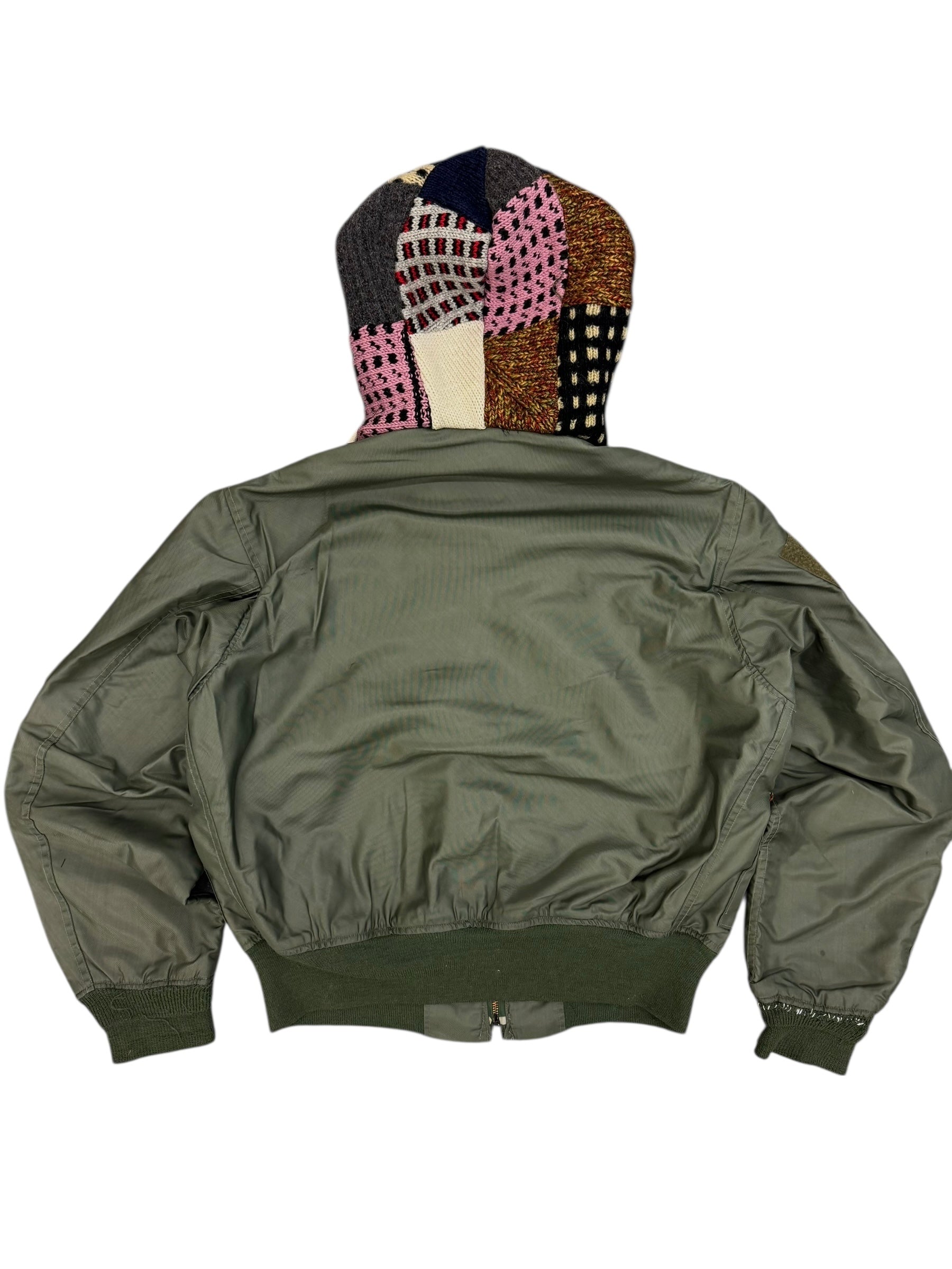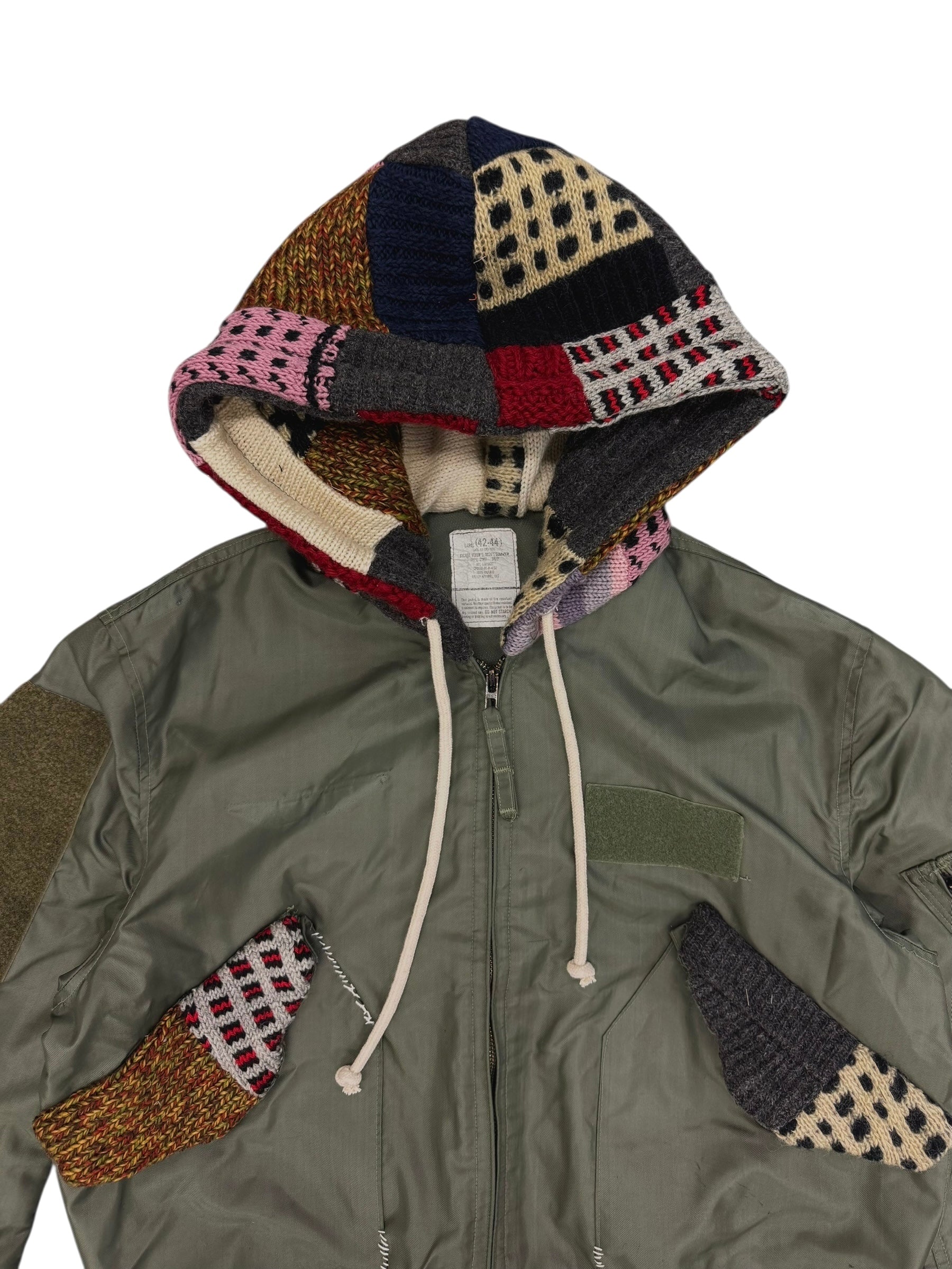 -Added patchwork hood made from multiple vintage hand-knit sweaters