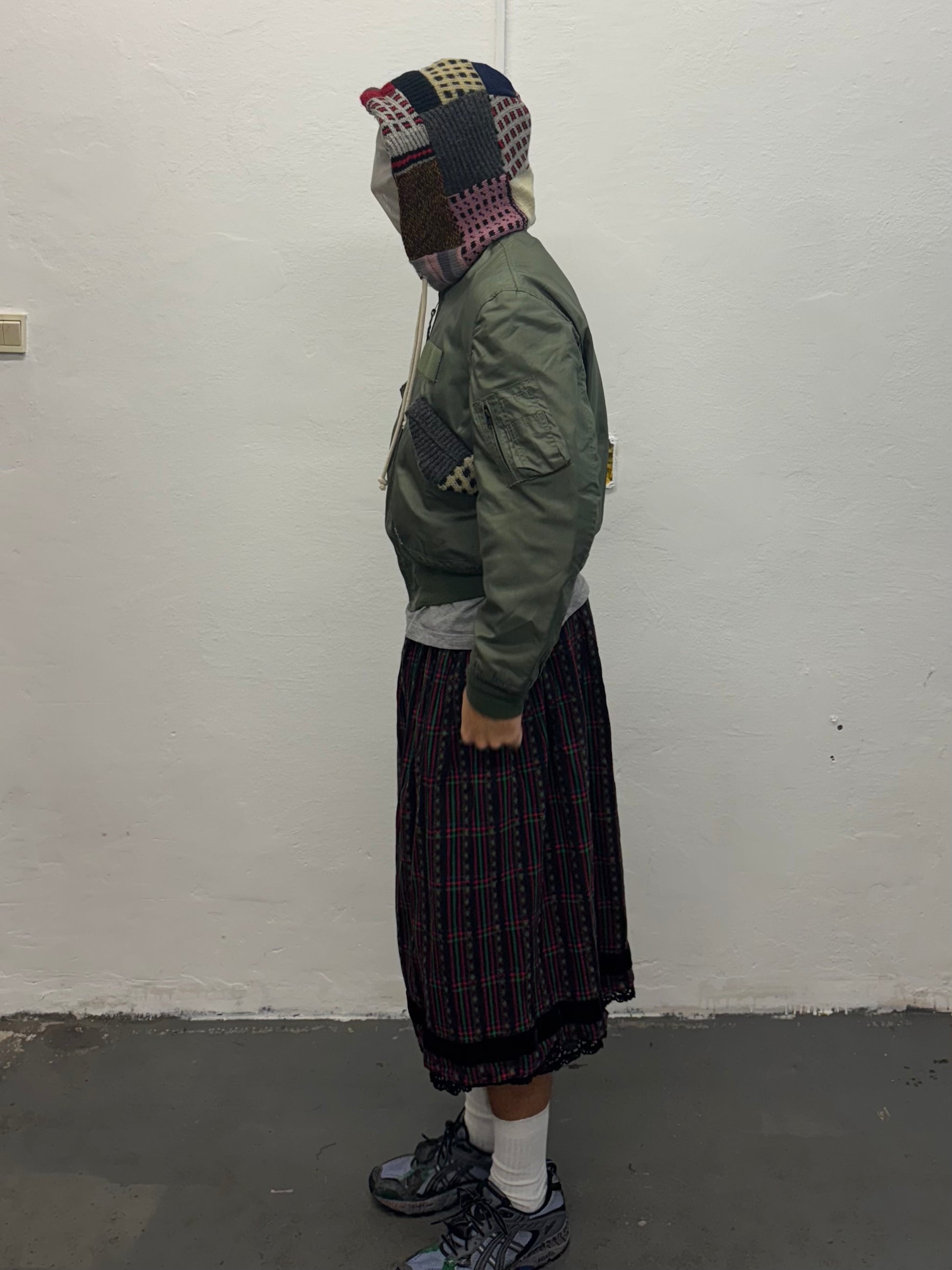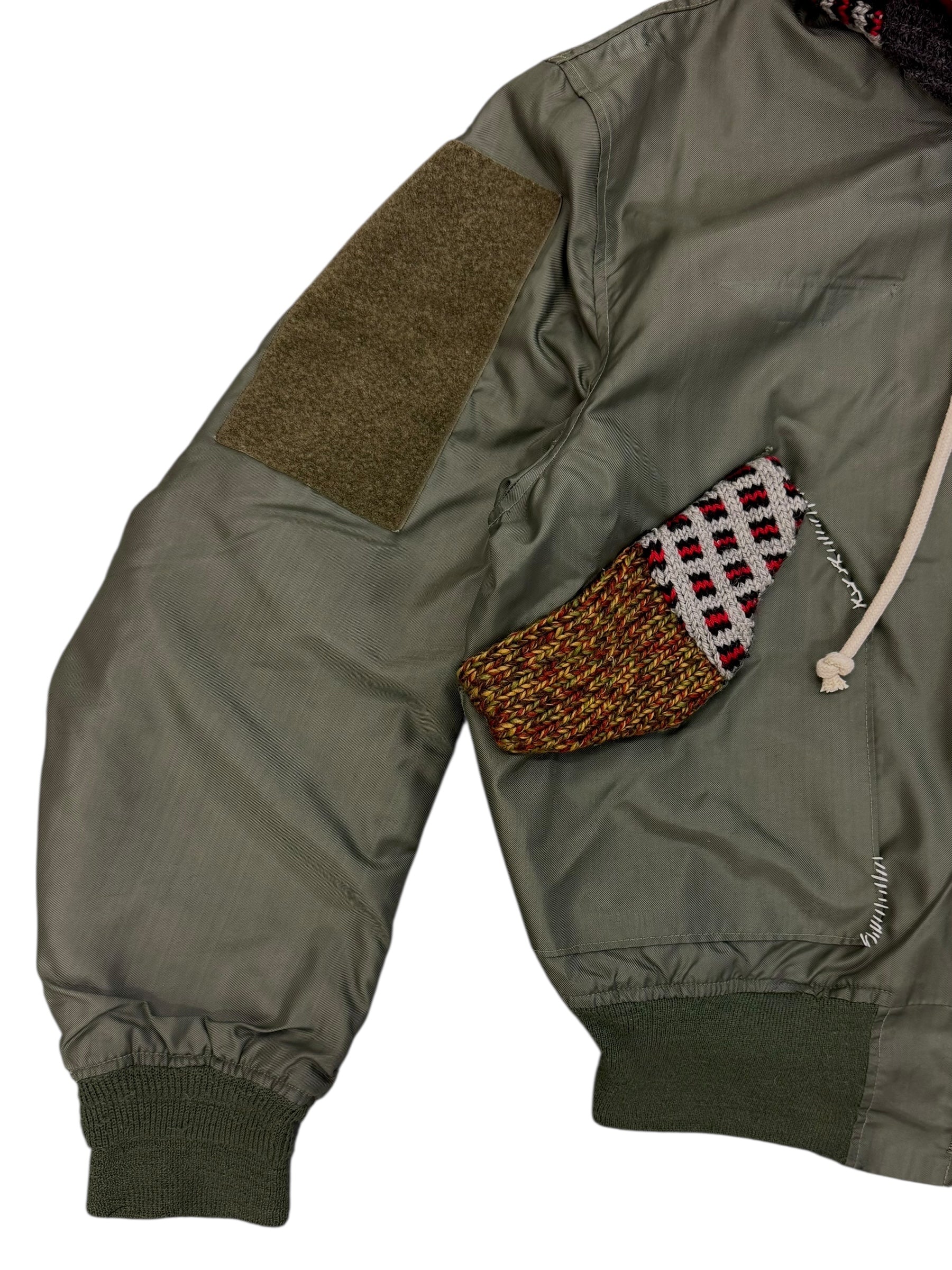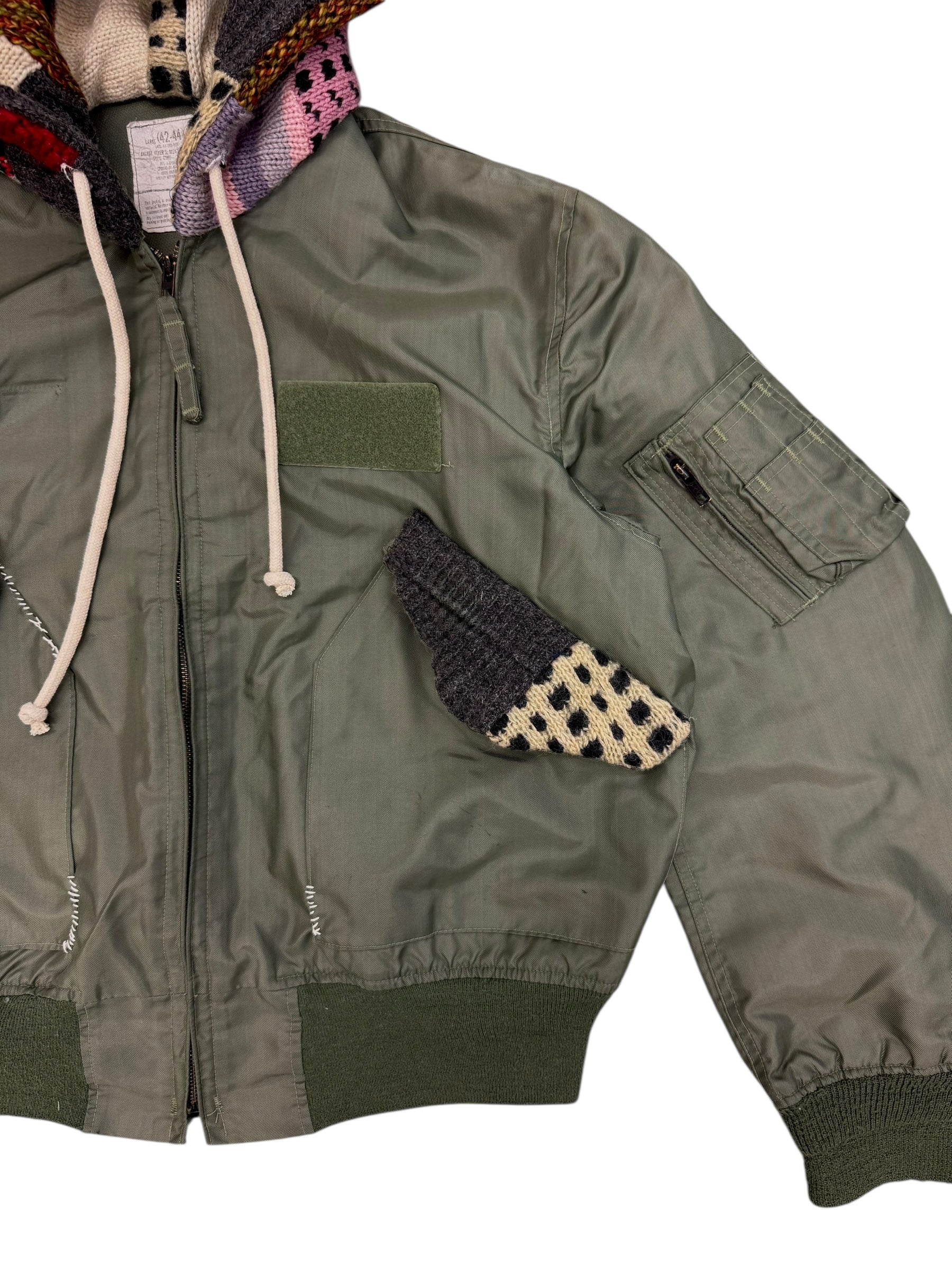 -Added patchwork hood made from multiple vintage hand-knit sweaters